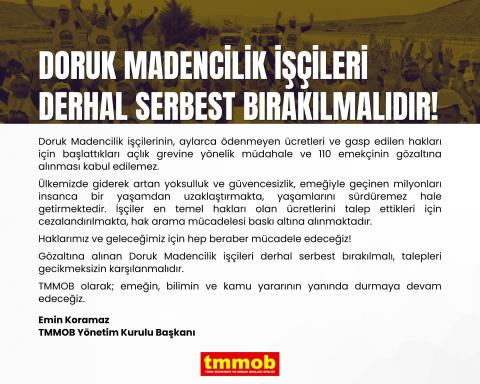 TMMOB Yönetim Kurulu Başkanı Emin Koramaz, 21 Nisan 2026 tarihinde "Doruk Madencilik İşçileri Derhal Serbest Bırakılmalıdır!  başlıklı bir basın açıklaması yaptı.