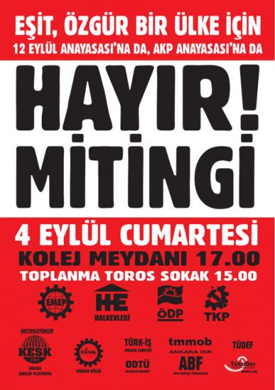 DİSK Ankara Bölge, KESK Ankara Şubeler Platformu, TMMOB Ankara İKK, Tüko-Der Ankara Şube, ODTÜ Mezunlar Derneği tarafından desteklenen ve EMEP, ÖDP, TKP ve Halkevleri tarafından düzenlenen "12 EYLÜL ANAYASASINA DA AKP ANAYASASINA DA HAYIR! " mitingi 4 Eylül 2010'da Ankara'da yapılacak.