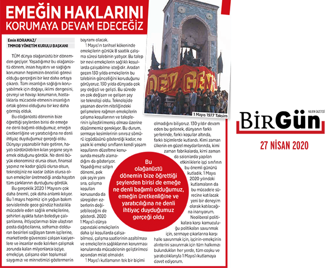 BirGün Gazetesi'nin 1 Mayıs'a yönelik başlattığı yazı dizisi kapsamında 27 Nisan 2020 tarihinde yayınlanan yazısında Emin KORAMAZ, "neoliberal politikalara karşı kamuculuğu politikaları savunmak için, sermaye çıkarlarına karşı halkı savunmak için, işçinin-emekçinin alınterini savunmak için" tüm halkımızı 1 Mayıs’ı kutlamaya davet etti.