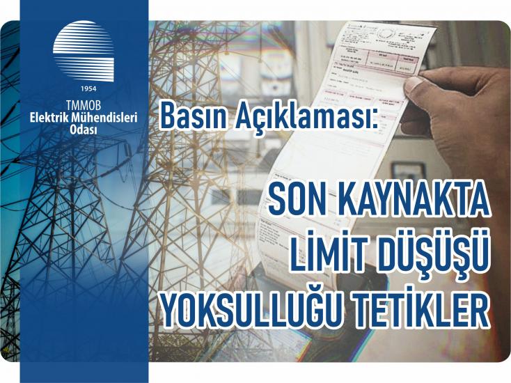 Elektrik Mühendisleri Odası, son kaynak tarifesinde yıllık elektrik tüketim limitinin hanelerde 3 bin kWh’a düşürülmesine yönelik hazırlıklara ilişkin 7 Ekim 2025 tarihinde yazılı bir basın açıklaması yaptı. Asgari tüketime yakın milyonlarca haneyi etkileyecek değişiklik “Spekülatif piyasa dalgalarının yükünü yurttaşa yüklemek açıkça kamu yararı taşımamaktadır” sözleriyle değerlendirildi. Dar gelirli ailelerin enerjiye erişim hakkının kısıtlanacağı uyarısı yapılan açıklamada, sosyal tarife uygulamasına dönülmesi çağrısı yinelendi.