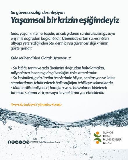TMMOB Gıda Mühendisleri Odası olarak, su güvencesi olmadan gıda güvencesinin mümkün olmadığını bir kez daha vurguluyor; halkımızı, meslektaşlarımızı ve yetkilileri, su hakkına sahip çıkmaya ve çevre düşmanı politikalara karşı durmaya çağırıyoruz. Suyumuzu, toprağımızı ve geleceğimizi savunmak için mücadeleye devam edeceğiz!