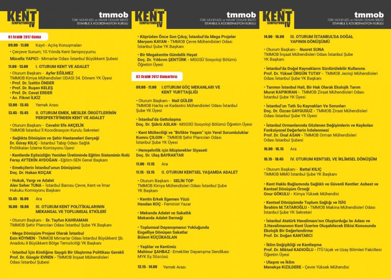 Tartışma başlıkları "Kent Ve Adalet, Emek, Meslek Örgütlerinin Perspektifinden Kent Ve Adalet, Kent Politikalarının Mekansal Ve Toplumsal Etkileri, Göç Mekanları Ve Kent Yurttaşlığı, Kentsel Yaşamda Adalet, İstanbul’da Doğal Yapının Dönüşümü, Kentsel Ve İklimsel Dönüşüm, İstanbul’da Arazi Ve Enerji Yönetimi, Mekan,Kimlik,Kültür, Medya, Kent Ve İletişim" olarak belirnen IV. İstanbul Kent Sempozyumu 3 Aralık 2017 günü "Kent ve Yaşam Alanları Mücadelesi Veren Tüm Kişi ve Kurumların Katılımı İle… "başlığıyla düzenlenecek İstanbul Kent Forumu ile son bulacak.