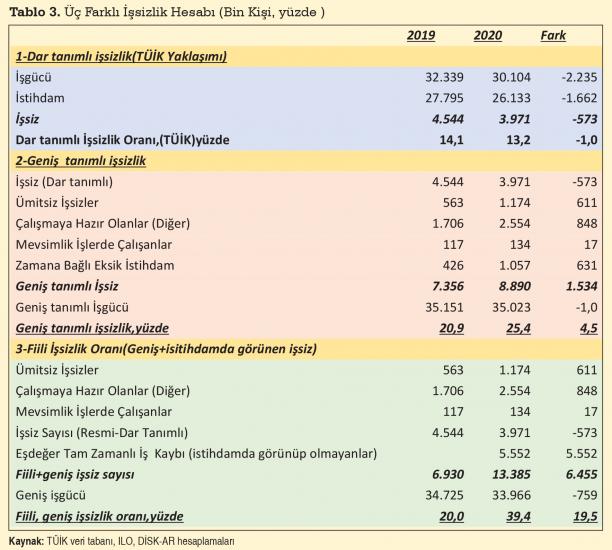 IMF, Dünya Bankası, OECD, TÜİK, Merkez Bankası, Hazine ve Maliye Bakanlığı verileri kullanılarak yapılan analizde, korona virüs salgınının 2020’nin ilk yarısında yol açtığı tahribatın boyutlarına yer verildi. Nisan-Haziran döneminde milli gelirin yüzde 15 dolayında küçülmüş olabileceği tahminine yer verilirken fiili-gerçek işsizliğin yüzde 40’lara, sayı olarak 13 milyona ulaştığına değinildi. Hükümetin önlem paketinin güven vermediğine ve çeşitli yan etkiler yarattığına değinilen analizde, toplumda siyasi değişim talebinin artacağına işaret edildi.