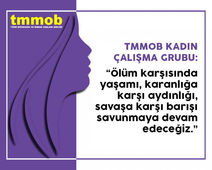 Biz TMMOB’li Kadınlar, eşitliğin, özgürlüğün, barışın, kardeşliğin hüküm sürdüğü başka bir dünyanın mümkün olduğu bilinciyle; 25 Kasım “Kadına Yönelik Şiddete Karşı Mücadele ve Uluslararası Dayanışma Günü"nde emeğimiz, bedenimiz ve yaşamımız üzerinde artan baskılara karşı direnmeye; ölümün karşısında yaşamı, karanlığa karşı aydınlığı, savaşa karşı barışı savunmaya devam edeceğimizi bir kez daha haykırıyoruz.