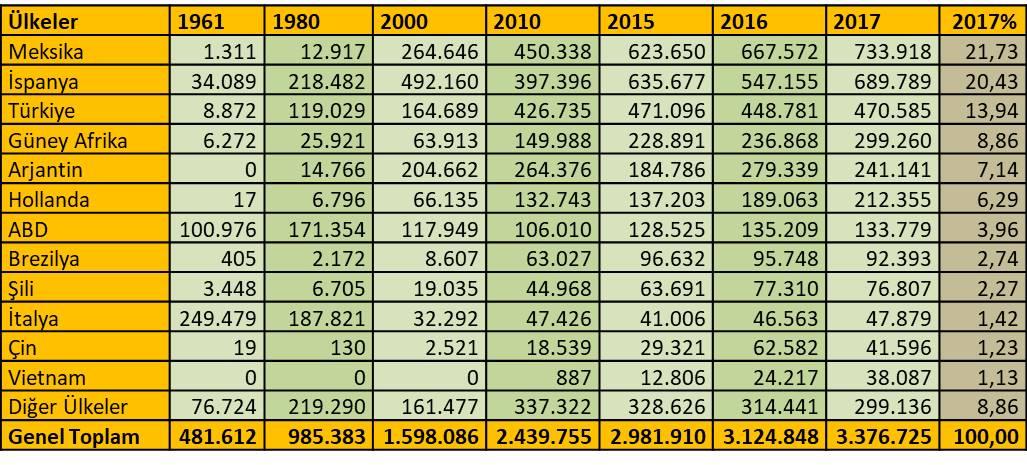 2017 yılı rakamlarıyla dünya limon ekim alanından aldığımız pay % 3, buna karşılık dünya üretiminden alınan pay yaklaşık % 6’dır.