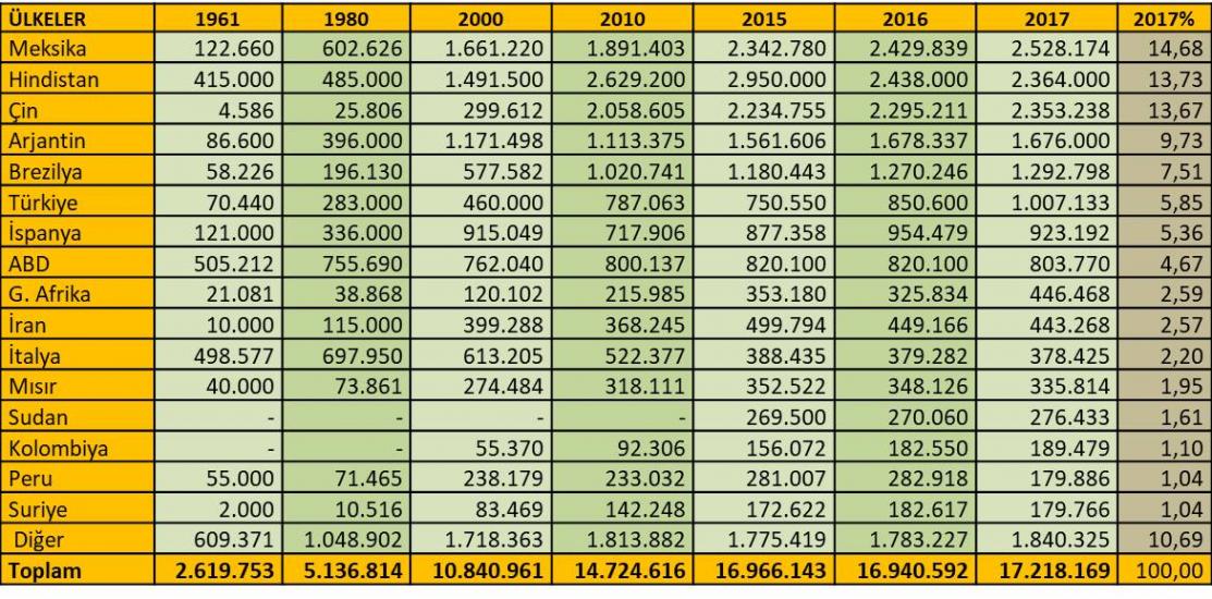 - Dünya limon üretimi 2017 yılında 17 milyon ton olmuştur. Üretimin %15’i Meksika tarafından gerçekleştirilmektedir. Meksika’da 2017 yılında yaklaşık 2.5 milyon ton limon üretilmiştir. Türkiye limon üretiminde altıncı sırada yer almaktadır.
