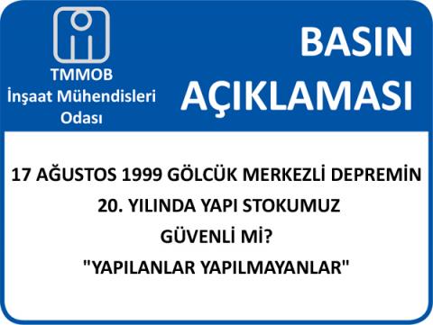 TMMOB İnşaat Mühendisleri Odası 17 Ağustos 1999 Depreminin 20. yılı dolayısıyla 17 Ağustos 2019 tarihinde bir basın açıklaması yaptı.